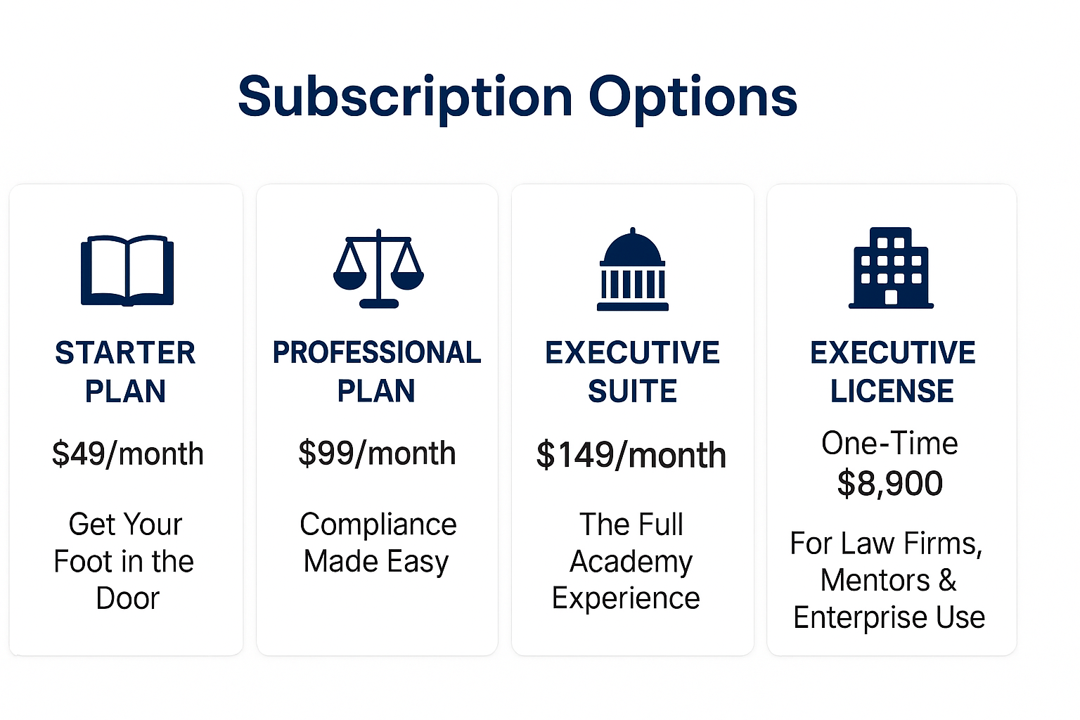 • Priority Support: onboarding assistance, curriculum updates, and legal education consulting